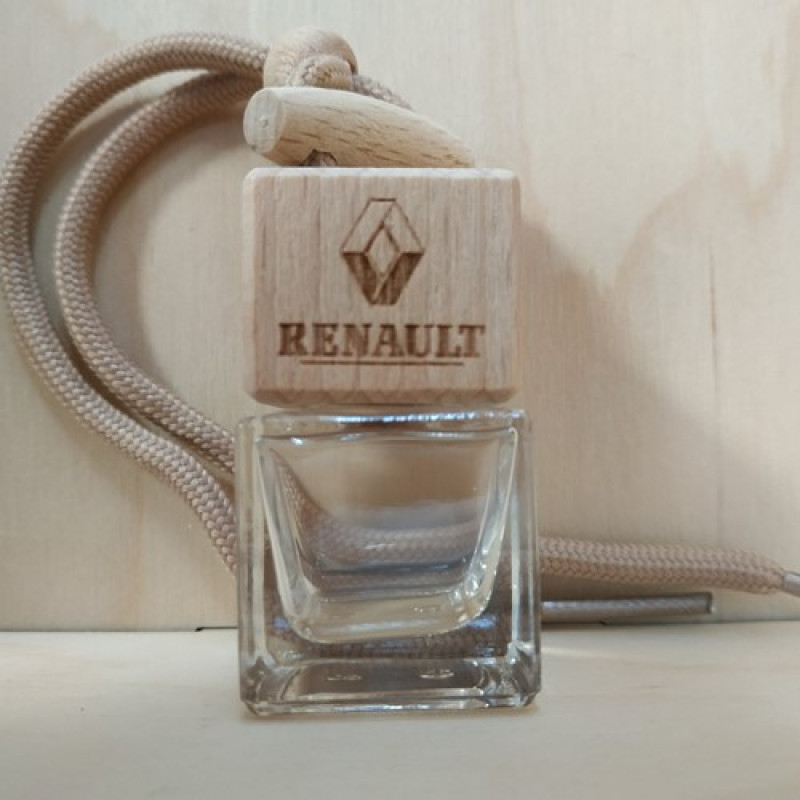 Стеклянный флакон с декоративной деревянной крышкой самый распространенный вид ароматизатора для автомобиля. Деревянная крышка впитывает аромат, а теплые потоки воздухообдува распространяют его в салоне машины. Крепится аромадиффузор двумя способами: с помощью шнурка или специальным креплением к дефлектору воздуховода. Стеклянный флакон с деревянной крышкой с логотипом Renault