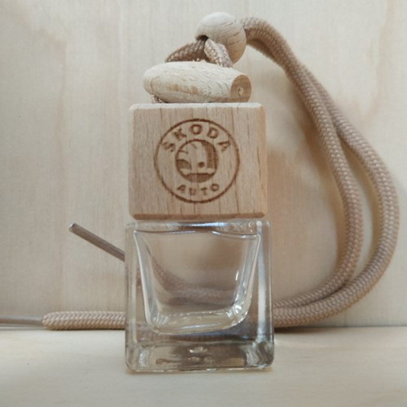 Стеклянный флакон с декоративной деревянной крышкой самый распространенный вид ароматизатора для автомобиля. Деревянная крышка впитывает аромат, а теплые потоки воздухообдува распространяют его в салоне машины. Крепится аромадиффузор двумя способами: с помощью шнурка или специальным креплением к дефлектору воздуховода. Стеклянный флакон с деревянной крышкой с логотипом Skoda