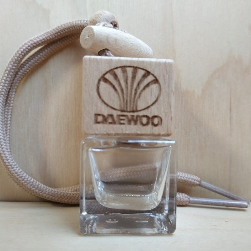 Стеклянный флакон с декоративной деревянной крышкой самый распространенный вид ароматизатора для автомобиля. Деревянная крышка впитывает аромат, а теплые потоки воздухообдува распространяют его в салоне машины. Крепится аромадиффузор двумя способами: с помощью шнурка или специальным креплением к дефлектору воздуховода. Стеклянный флакон с деревянной крышкой с логотипом Daewoo