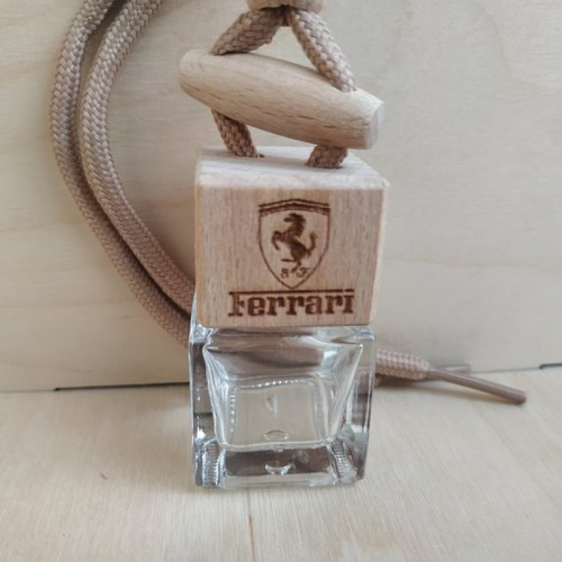 Стеклянный флакон с декоративной деревянной крышкой самый распространенный вид ароматизатора для автомобиля. Деревянная крышка впитывает аромат, а теплые потоки воздухообдува распространяют его в салоне машины. Крепится аромадиффузор двумя способами: с помощью шнурка или специальным креплением к дефлектору воздуховода. Стеклянный флакон с деревянной крышкой с логотипом Ferrari