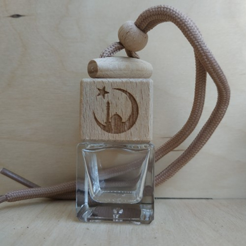 Стеклянный флакон с декоративной деревянной крышкой самый распространенный вид ароматизатора для автомобиля. Деревянная крышка впитывает аромат, а теплые потоки воздухообдува распространяют его в салоне машины. Крепится аромадиффузор двумя способами: с помощью шнурка или специальным креплением к дефлектору воздуховода. Флакон с деревянной крышкой с изображением Полумесяц.