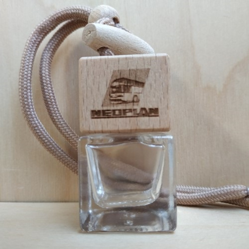 Стеклянный флакон с декоративной деревянной крышкой самый распространенный вид ароматизатора для автомобиля. Деревянная крышка впитывает аромат, а теплые потоки воздухообдува распространяют его в салоне машины. Крепится аромадиффузор двумя способами: с помощью шнурка или специальным креплением к дефлектору воздуховода. Стеклянный флакон с деревянной крышкой с логотипом Neoplan